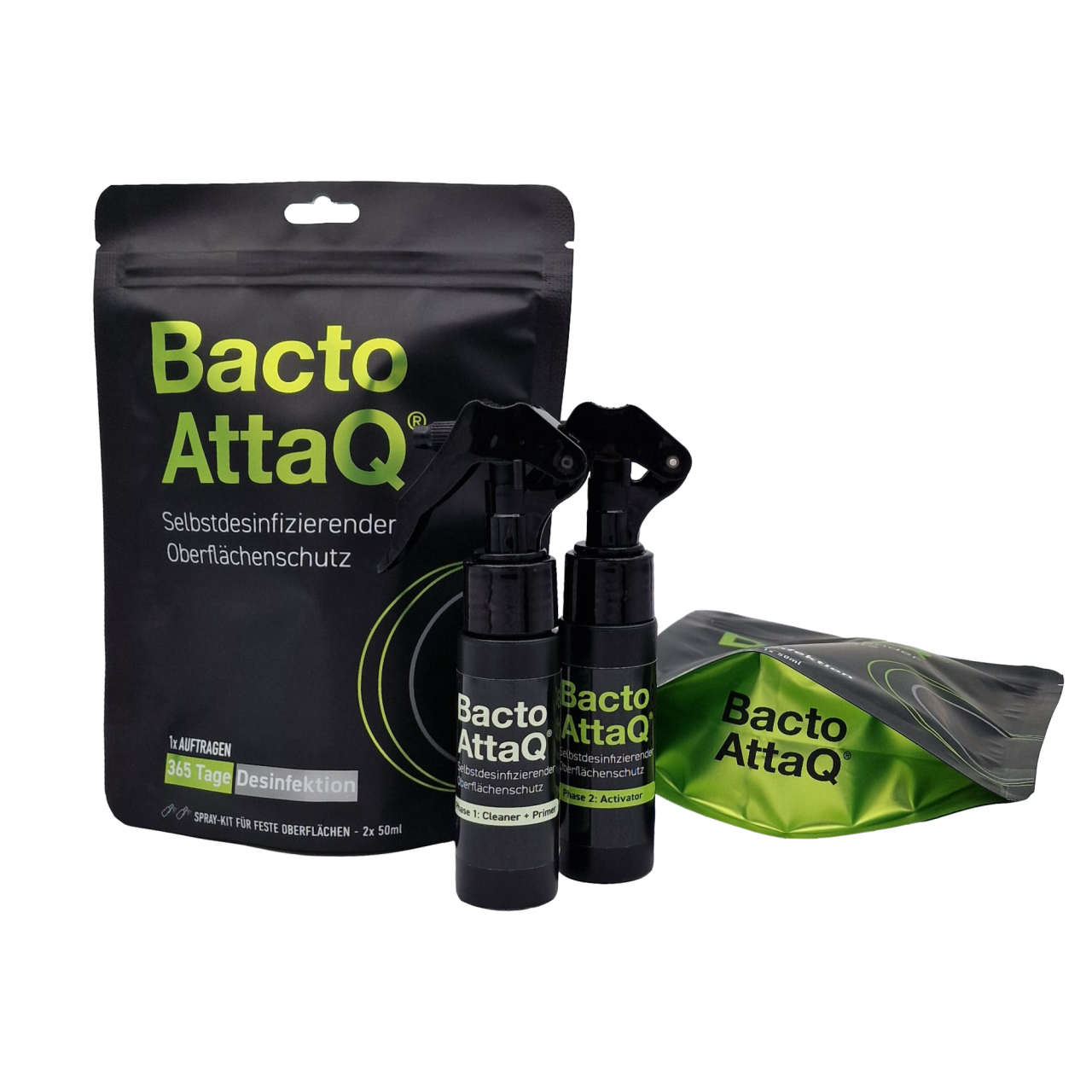 BactoAttaQ® - selbstdesinfizierender Oberflächenschutz für länger als 365 Tage BactoAttaQ® schließt die Desinfektionslücke: Einmal aufgetragen bildet BactoAttaQ® eine selbstdesinfizierende Schutzschicht auf den behandelten Oberflächen. Die unsichtbare Schutzschicht bleibt für länger als 365 Tage bestehen und reduziert kontinuierlich bis zu 99,999 % der Bakterien, Pilze, Algen, Hefen und speziellen Viren*. Durch die antimikrobielle Wirkungsweise werden zudem die Schimmel- und bakteriell bedingte Geruchbildung konstant gehemmt. Die BactoAttaQ® Technologie wurde 2019 mit dem German Innovation Award ausgezeichnet.